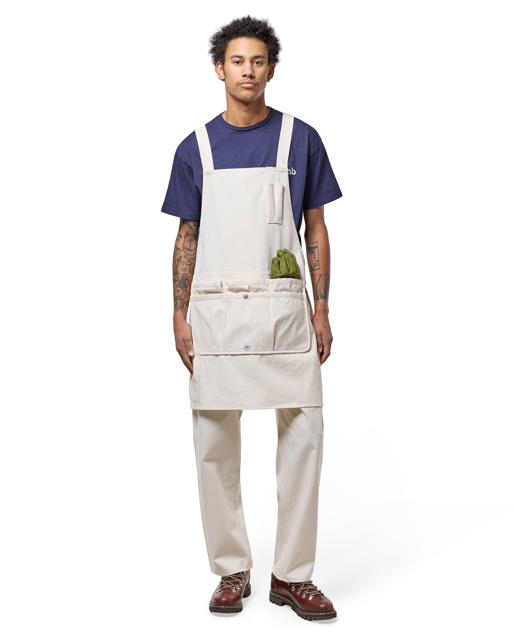 Introducing an apron from the Whole Hole series, made with cotton that doesn’t feel too heavy. It features a pen holder at the chest, a generously sized pocket at the front, plus additional pockets along the hem. Making this a versatile piece that works just as well in the garden as it does in the kitchen.